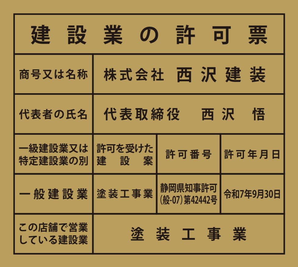 このたび、株式会社西沢建装は 「(塗装工事業)建設業許可(般-7)第42442号」 を静岡県知事より取得いたしました。